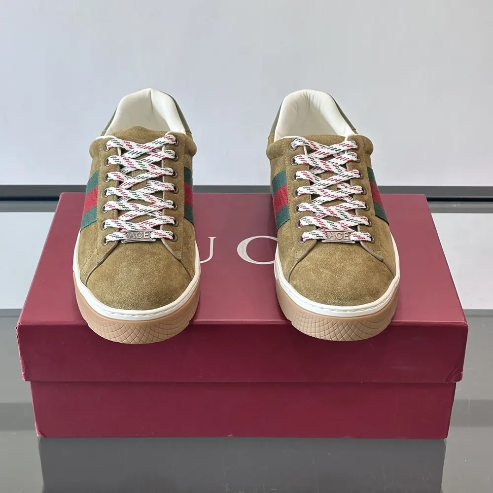 - Crafted in sumptuous suede, the style presented here is complete with a metal “ACE” tag and the House’s distinctive green and red Web stripe.