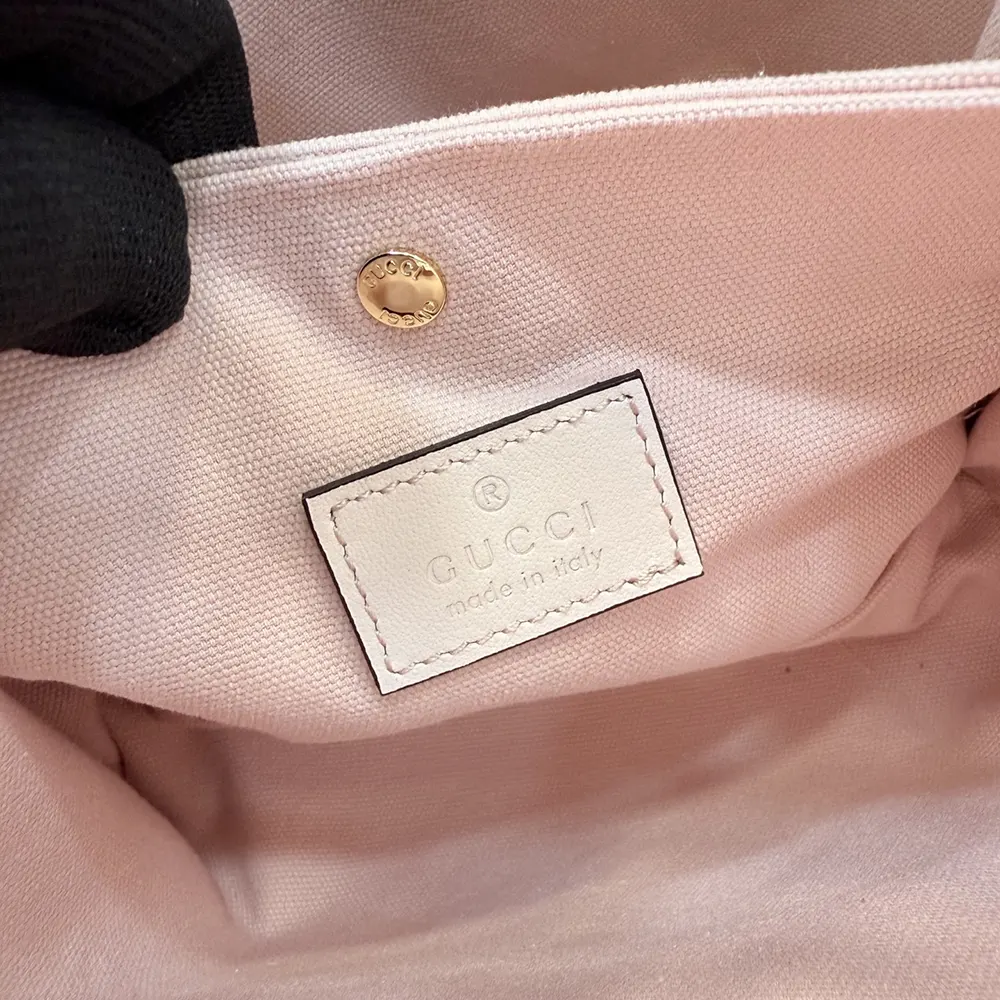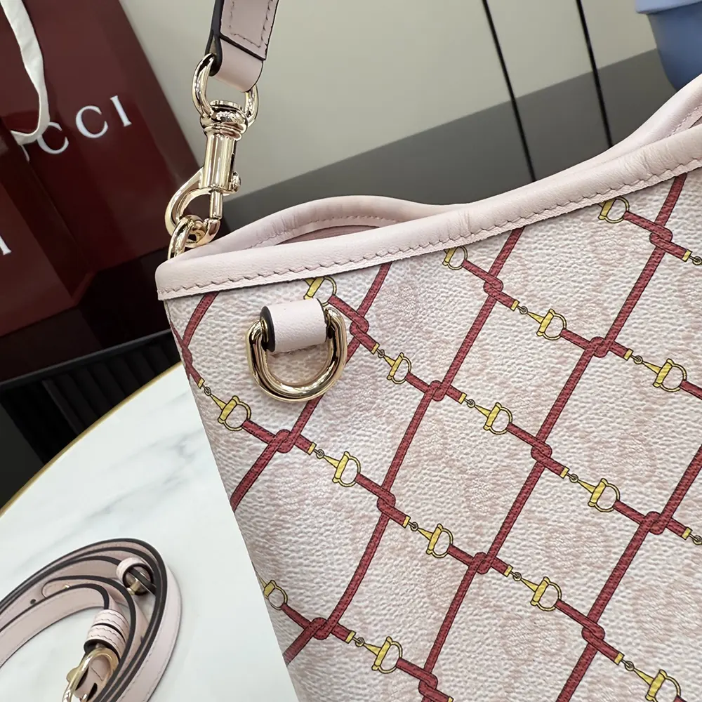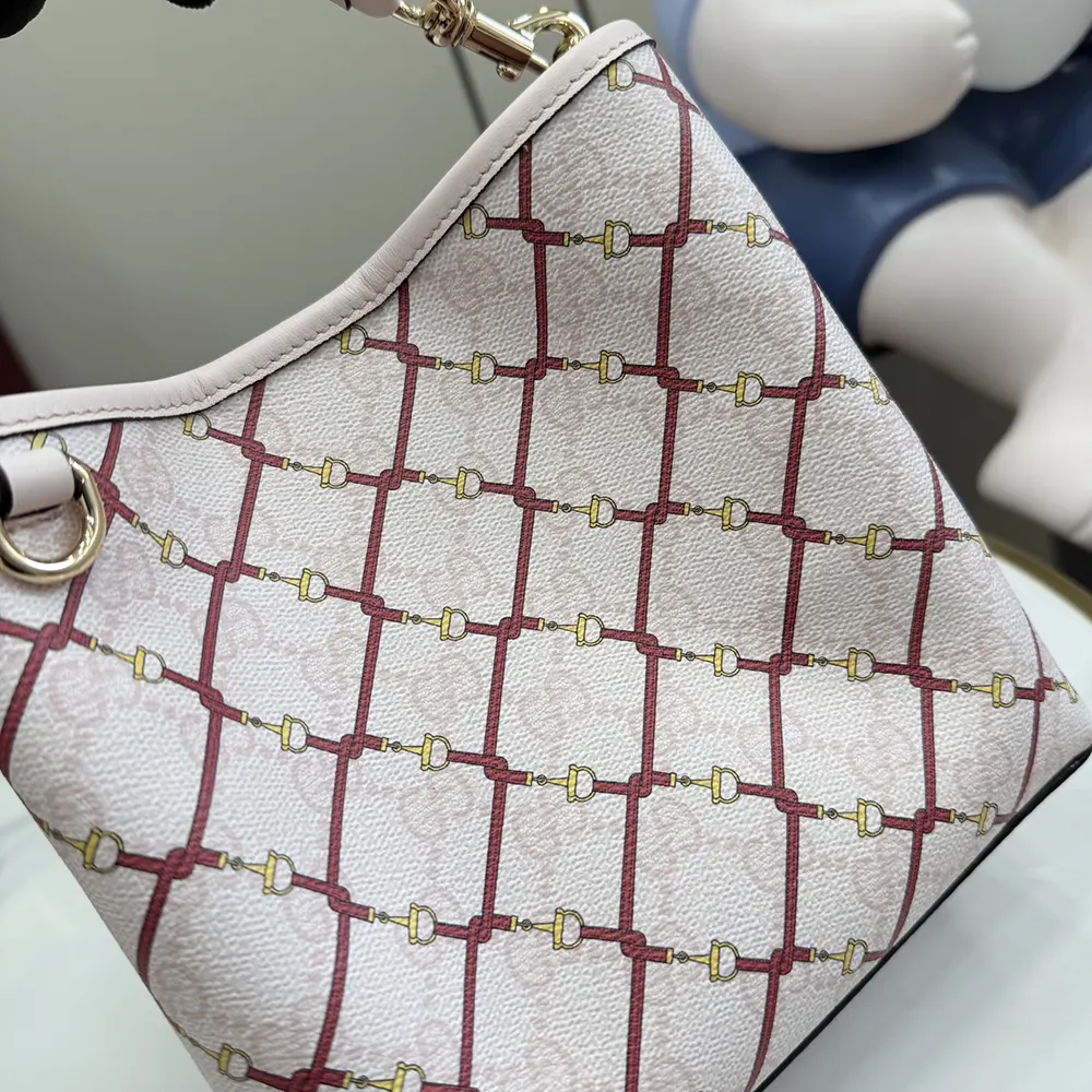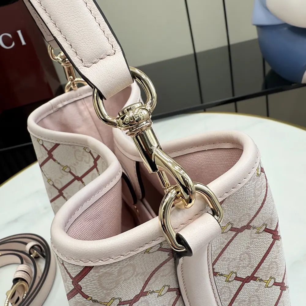 - Highlighting a stirrup motif over the GG Monogram coated fabric, this bucket bag enriches functional design with an interior compartment in Web cotton lining.