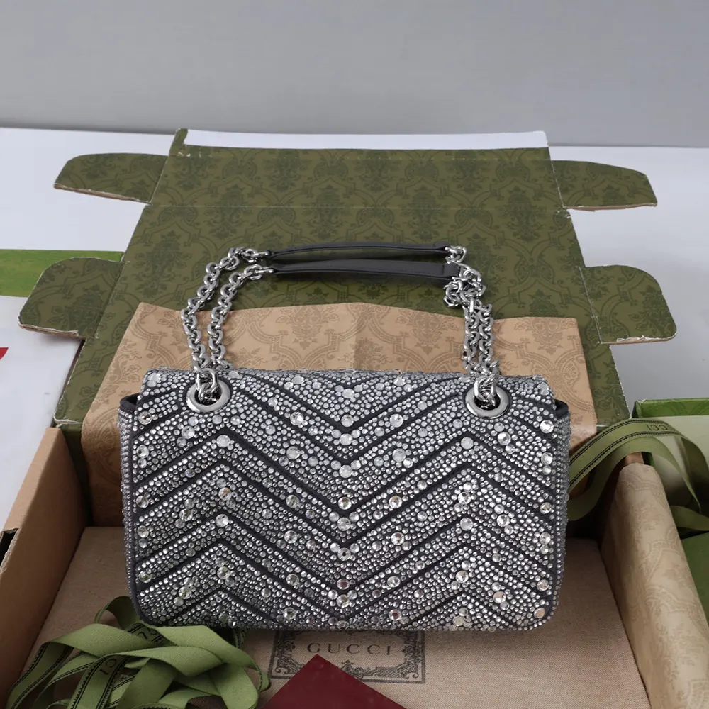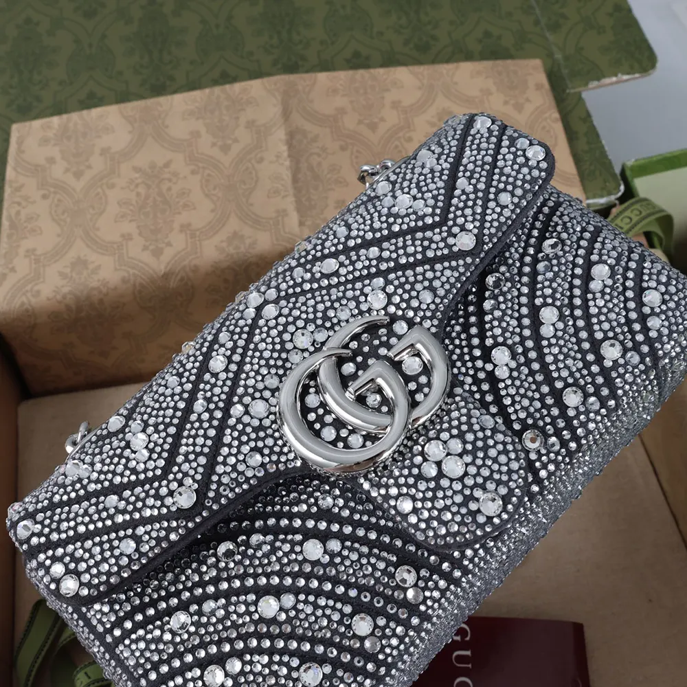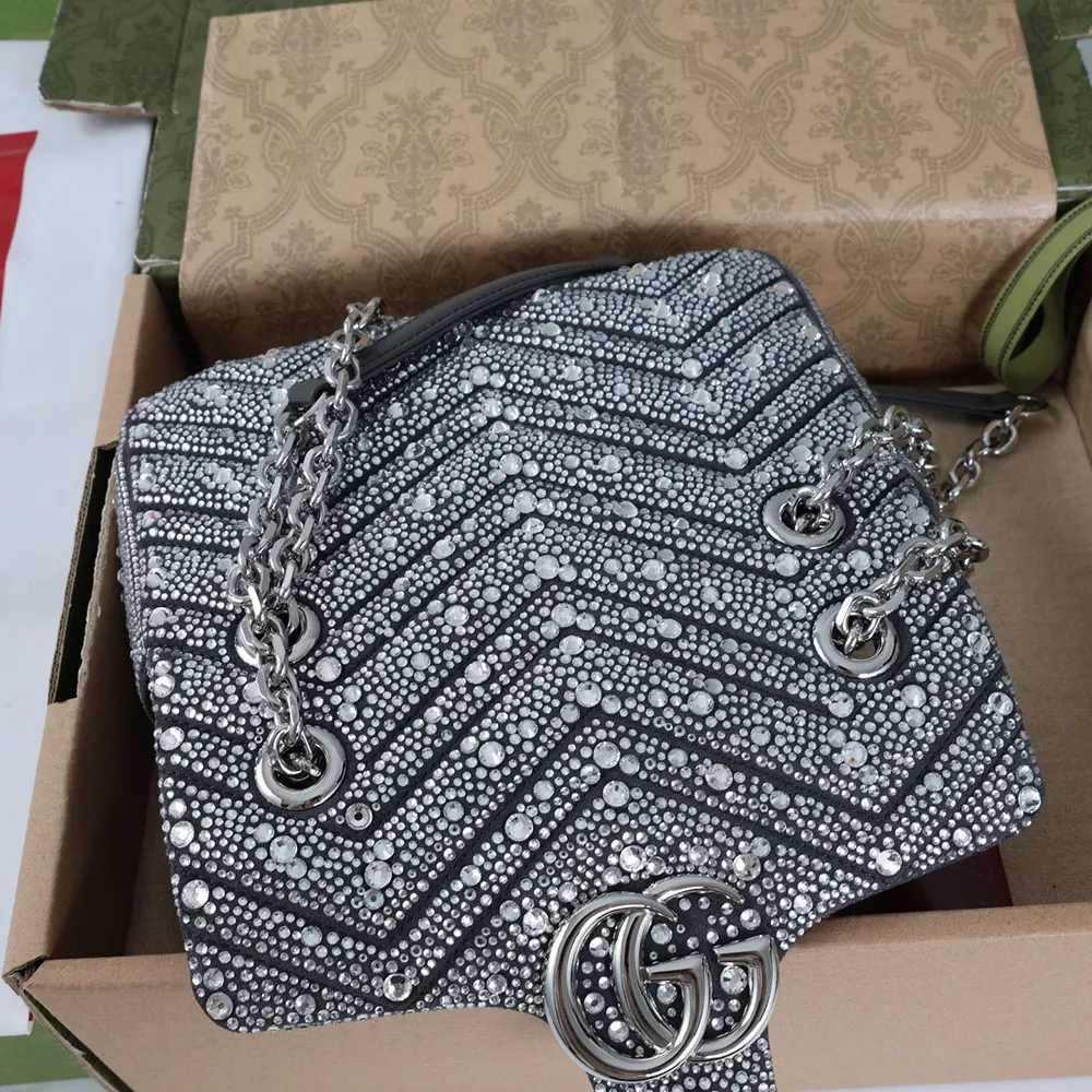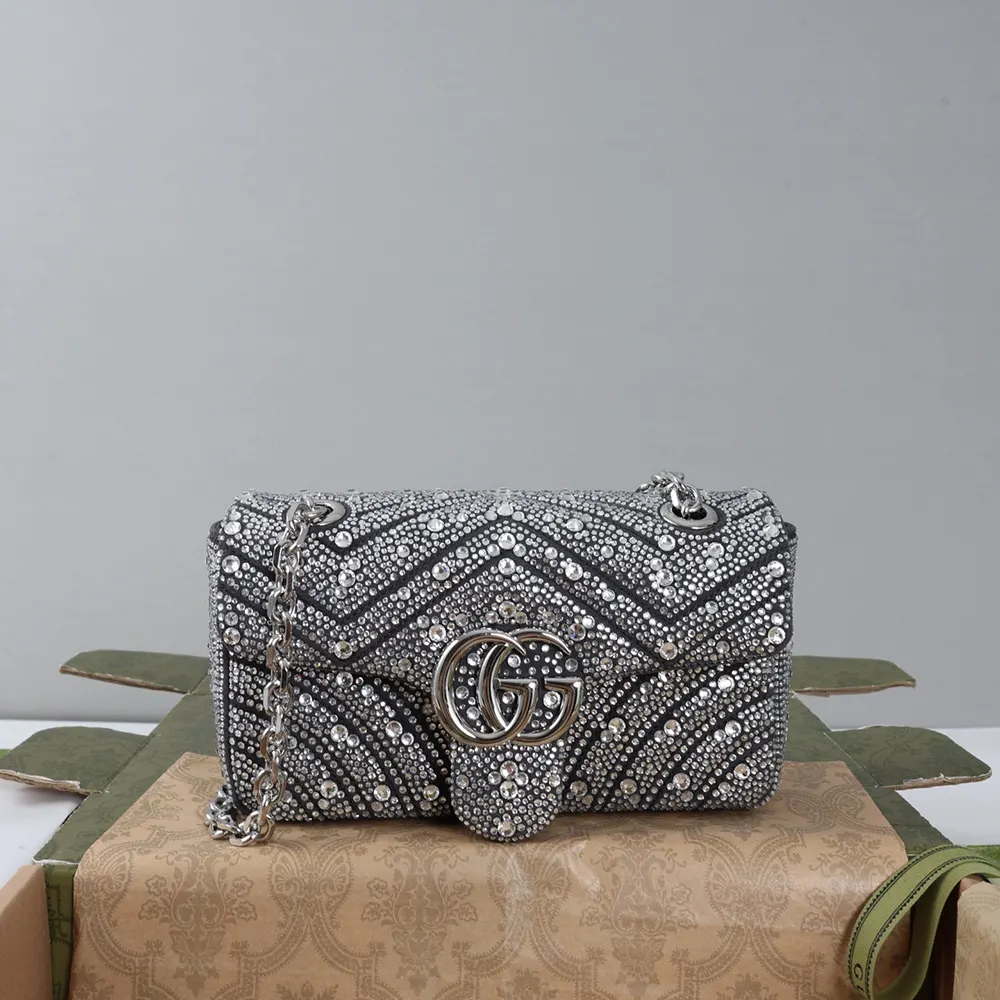 - The GG Marmont, a signature collection of the House, features the emblematic Double G and a faceted chain strap, presented here in silver-toned finish.