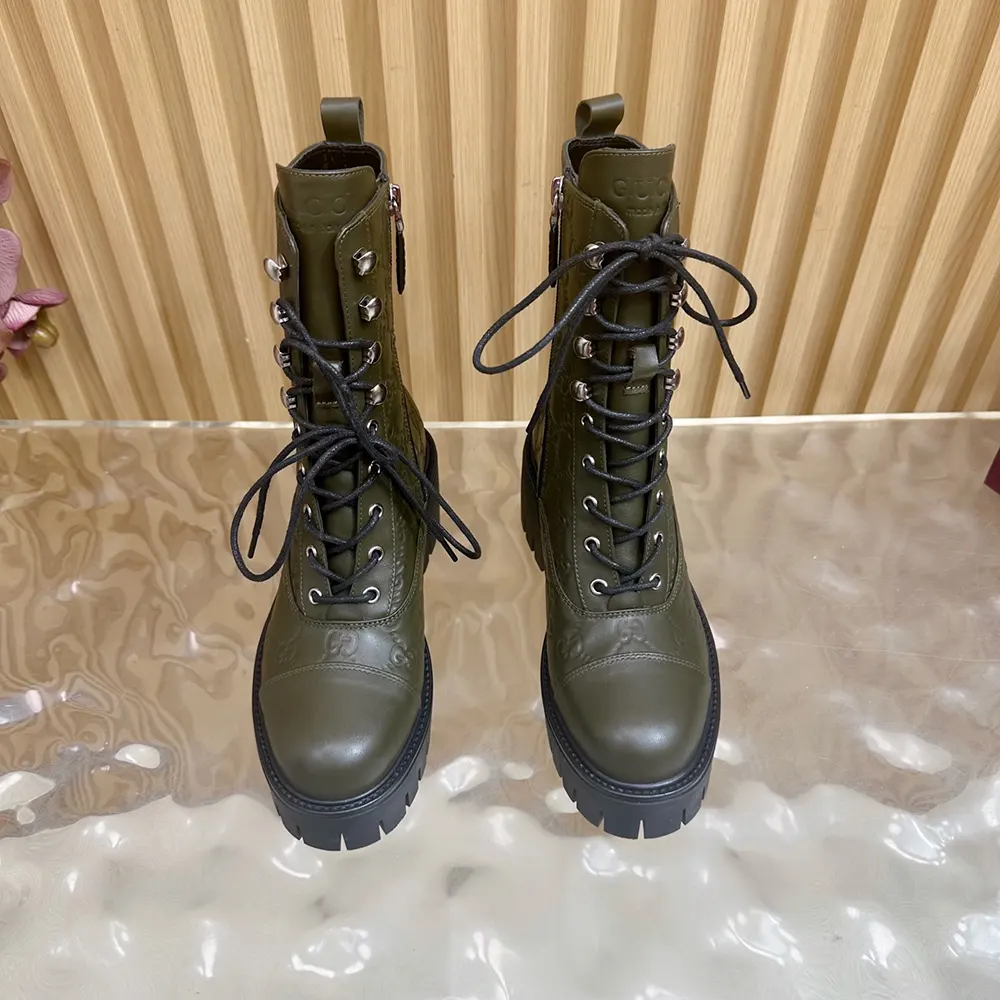 Gucci Women Lace-Up Ankle Boot With GG Dark Green GG Leather 840739