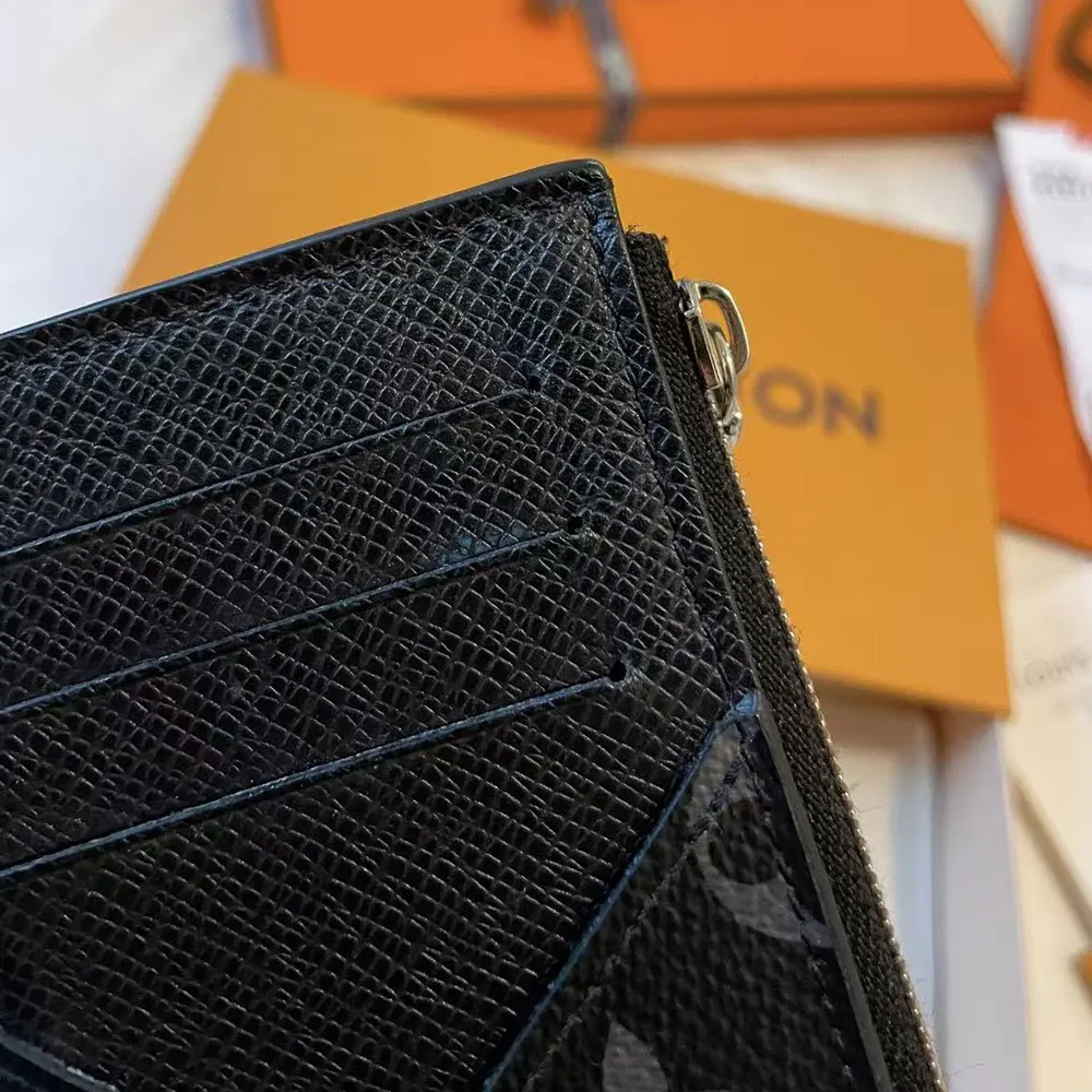 - The Coin Card Holder’s sleek design is complemented by the unified colorway of the Monogram canvas and Taiga leather from which it’s made.
