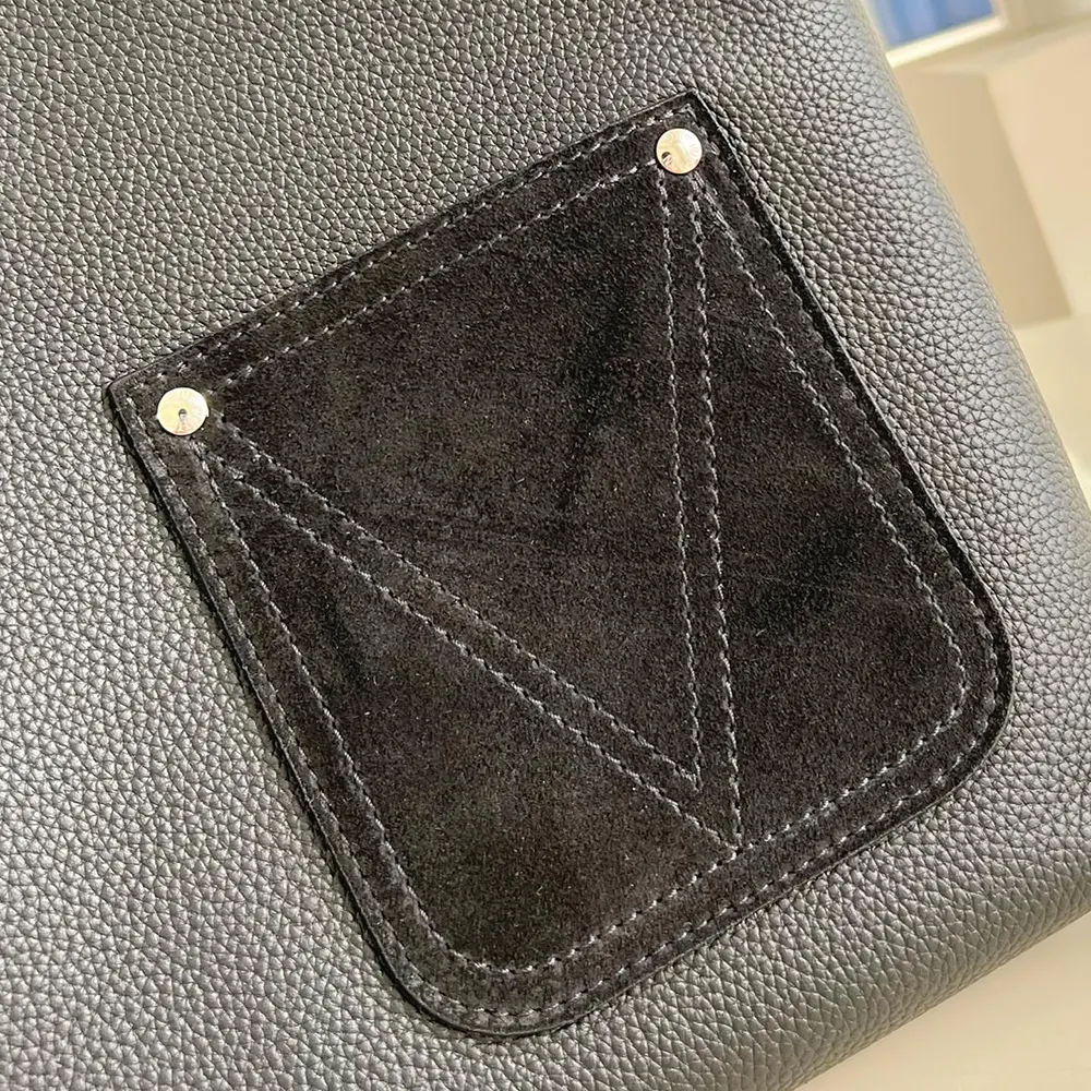 - Each side features a pocket with a discreet stitched V signature, while a removable suede pouch adds extra functionality.