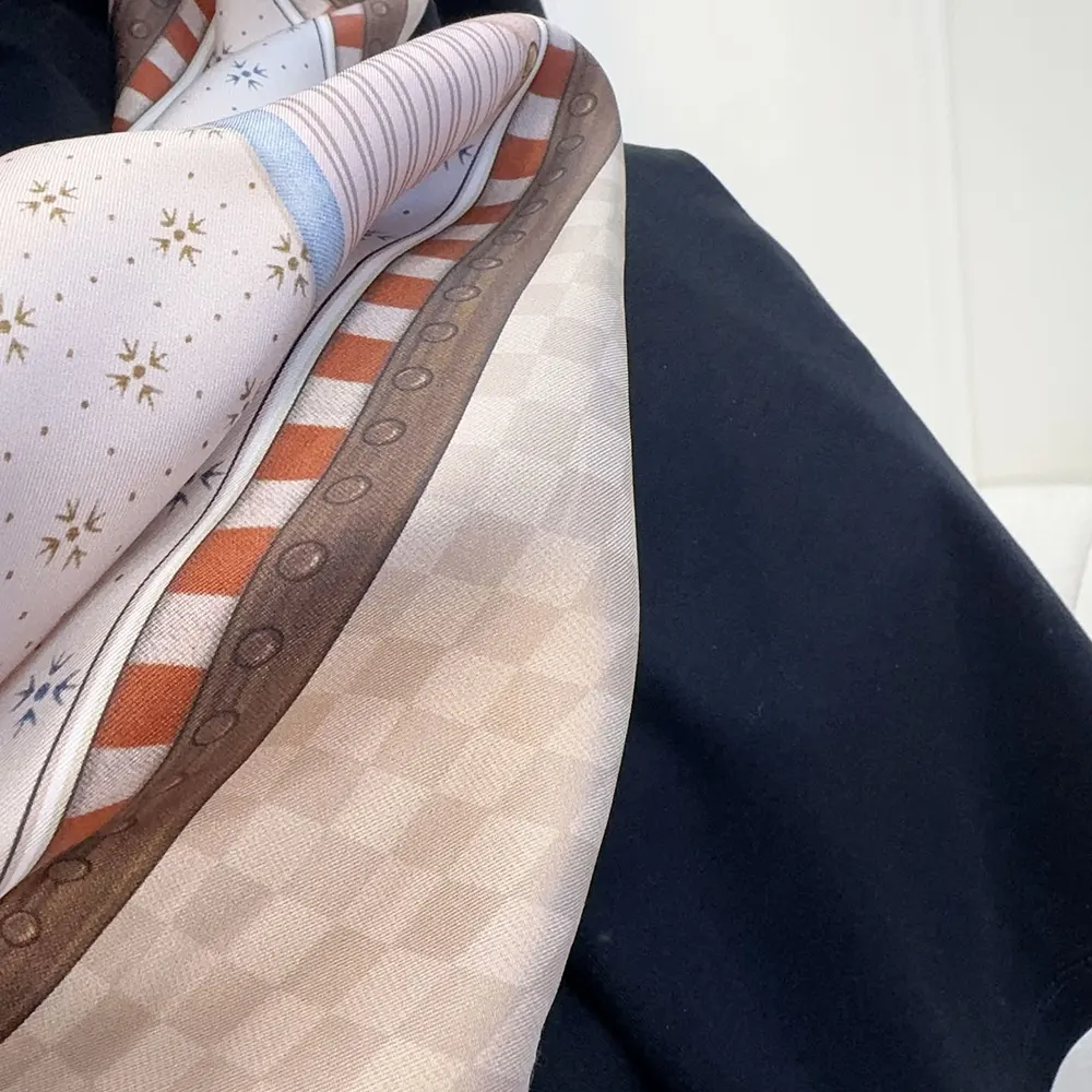 - The crew neckline is finished with a removable silk scarf featuring a signature print of the inside of an archival Louis Vuitton trunk as an elegant nod to the House’s travel heritage.