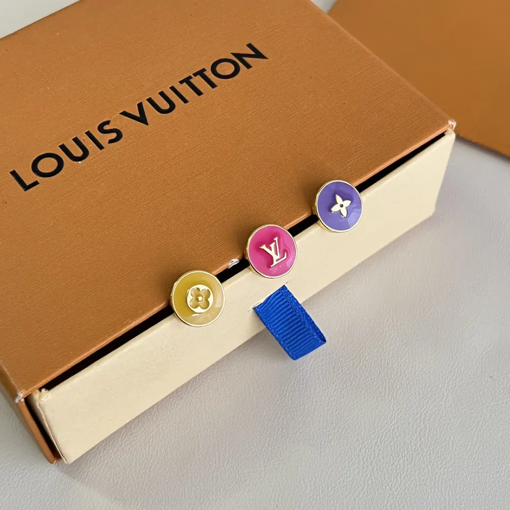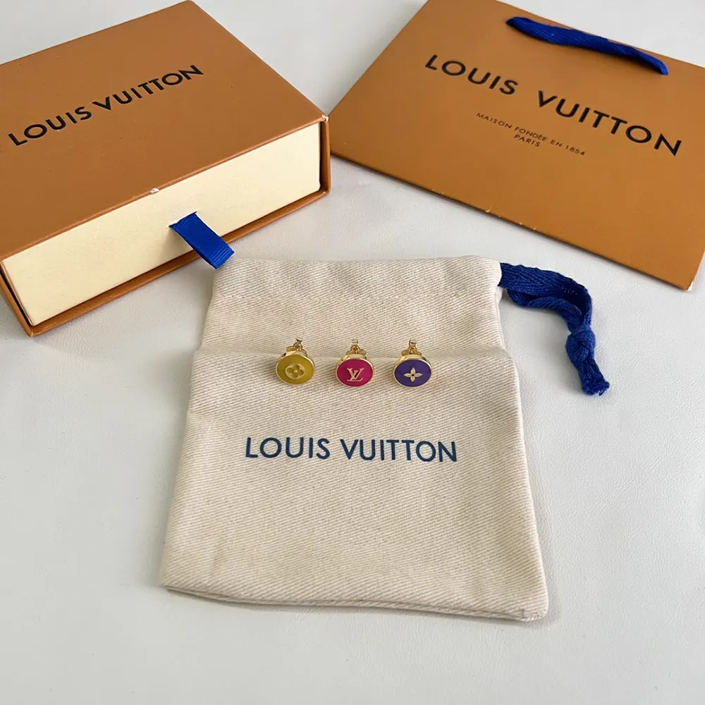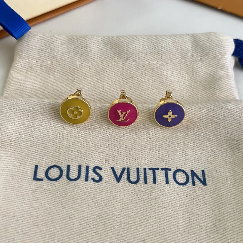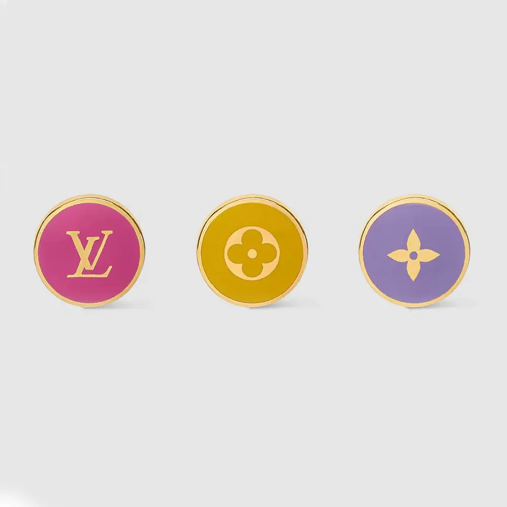 Crafted in gold-toned metal, the set comprises three earrings in vibrant colors adorned with Monogram Flowers and the LV Initials.
