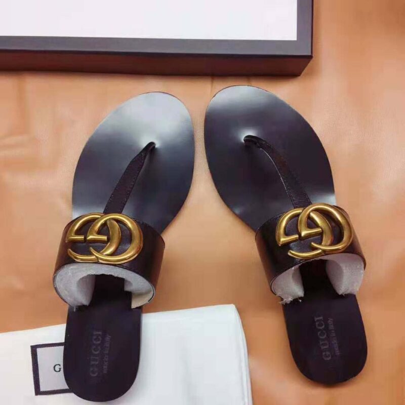 - The leather thong sandal is embellished with the Double G hardware—an archival design from the ’70s.